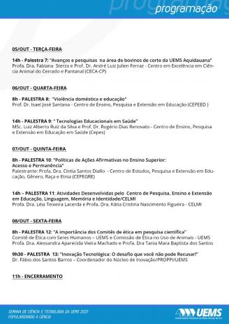 Na terça-feira (05/10), às 8h, será ministrada a palestra “Bancada hidropônica de baixo custo”, pelo Prof. Dr. Cássio de Castro Seron - Centro de Desenvolvimento Sustentável do Bolsão Sul-Mato-Grossense (CEDESU) da Unidade Universitária de Cassilândia (UUC); às 9h30, a sexta palestra: “Ciência e Tecnologia na Agronomia” com os professores Dra. Cristiane Gonçalves de Mendonça e Dr. Marcos Antonio Camacho - Centro de Estudos em Produção Vegetal (CEPROV). E no período vespertino, 14h, o tema abordado será: “Avanços e pesquisas na área de bovinos de corte da UEMS Aquidauana” - Profa. Dra. Fabiana Sterza e Prof. Dr. André Luiz Julien Ferraz - Centro em Excelência em Ciência Animal do Cerrado e Pantanal (CECA-CP).