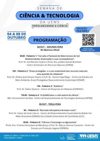 As atividades da Semana de Ciência e Tecnologia da Universidade Estadual de Mato Grosso do Sul (UEMS), ocorrerão de 04 a 08 de outubro, com 13 palestras on-line, transmitidas pelo canal oficial da UEMS no Youtube, com emissão de certificado para os participantes inscritos.