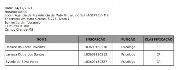 No edital nº 11, está a convocação dos candidatos habilitados no certame para a apresentação dos documentos e comprovação dos requisitos para contratação. Os habilitados deverão comparecer no dia 14 de dezembro de 2021, a partir das 8 horas, na Agência de Previdência de Mato Grosso do Sul (Ageprev), localizada na Av. Mato Grosso, 5.778, Bloco I, Bairro: Jardim Veraneio, Campo Grande.