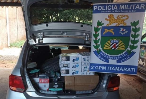 Um dos veículos, VW/Gol com placas de Anaurilândia, conduzido por um homem de 30 anos continha cinco caixas de cigarros, 10 bolas cheias de pneus e duas caixas de óculos. No veículo também estava outro homem de 32 anos, ambos foram indagados sobre a mercadoria e disseram que foram contratados para o transporte até a cidade de Campo Grande (MS).