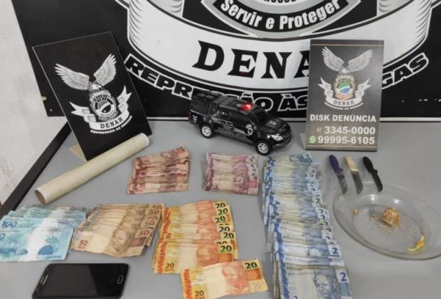 Na ocasião foi apreendida uma pedra de pasta-base, com peso de 20g, droga suficiente para confeccionar pelo menos 30 paradinhas semelhantes à apreendida com o usuário, além da quantia de R$ 1.298,00 em dinheiro trocado, típico da venda de drogas.