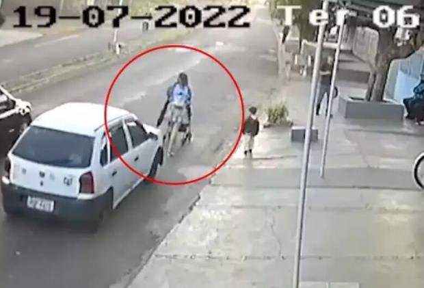 A mulher caminhava próximo ao meio-fio com o bebê no carrinho e o outro filho, quando o VW Gol branco atropelou a vítima e fugiu.