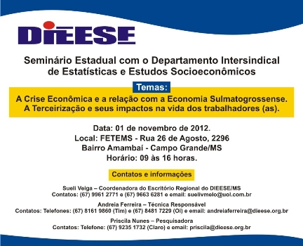 O DIEESE (Departamento Intersindical de Estatísticas e Estudos Socioeconômicos) promove no dia 1° de novembro a partir das 9 horas no auditório da FETEMS (Federação dos Trabalhadores em Educação de Mato Grosso do Sul) um seminário estadual para abordar a relação da crise econômica com a economia sul-mato-grossense e os impactos da terceirização na vida do trabalhador.