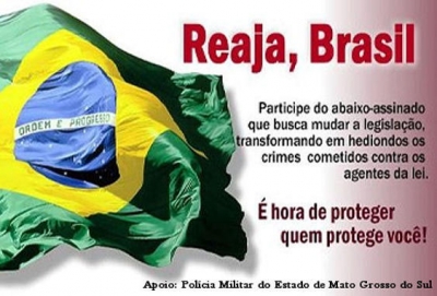 Um movimento em prol da alteração do Código Penal e da Lei de Crimes Hediondos colhe assinaturas, desde segunda-feira (14), em Mato Grosso do Sul. O objetivo do “Reaja, Brasil”, de acordo com a Polícia Militar (PM), é aumentar a pena dos crimes cometidos contra policiais, bombeiros, guardas municipais, agentes penitenciários e servidores do Poder Judiciário, Ministério Público e Defensoria Pública no exercício da função ou em razão dela.