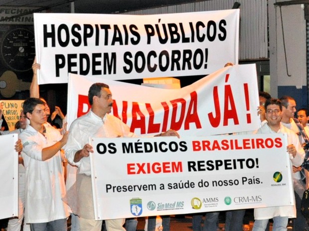 Médicos foram às ruas de Campo Grande nesta quarta-feira (3) pedindo que profissionais estrangeiros, que devem ser trazidos pelo governo para trabalhar no interior do Brasil, passem pela prova Revalida para que tenham seus diplomas aceitos. Eles também afirmam que a solução para os problemas na área da saúde é restruturação de hospitais e postos de saúde.