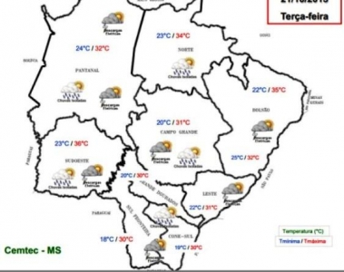 No período da tarde o calor será maior em Cassilândia, Paranaíba, Inocência, Selvíria, no bolsão, Coxim, São Gabriel do Oeste, na região norte, com temperatura máxima de 35°C. Porto Murtinho também terá uma tarde muito quente com quase 38°C.